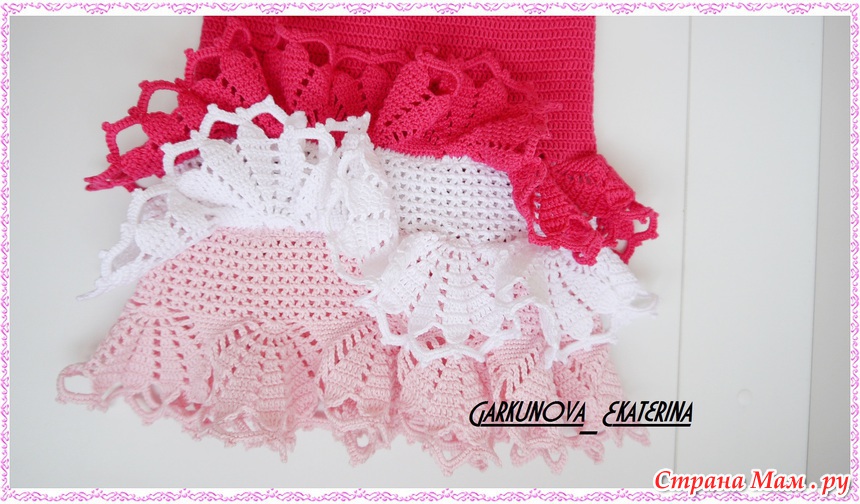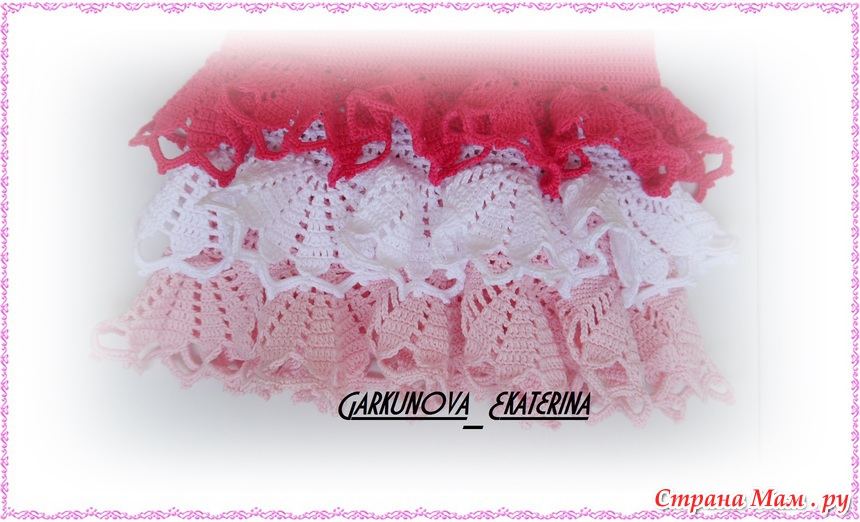 На каждую оборку ушло примерно 70 грамм, пришлось покупать по 2 моточка белого и розового, и по полмоточка от каждого осталось.