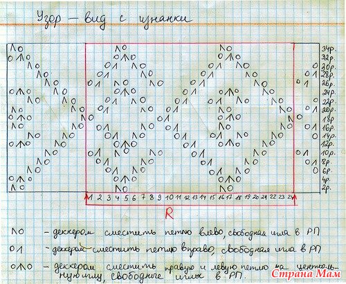 В рядах 181-214 слева убавить по 1 п. равномерно всего 27 п. (перенести на соседнюю иглу одноушковым деккером). В рядах 215-260 также слева убавить по 1 п. равномерно всего 21 п.