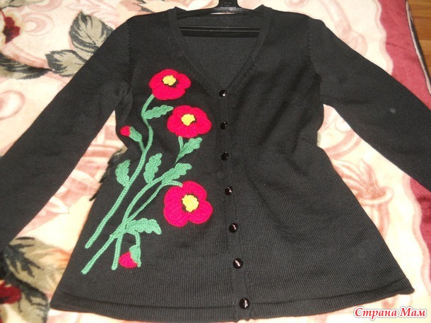 Здравствуйте дорогие девочки! Спешу скорей показать жакетик связанный на заказ. Фото на клиентке пока нет но обещали прислать. Так что пока так. Связан из белорусской п. ш. Цветочки связала крючком и пришила - получилась вот такая апликация.