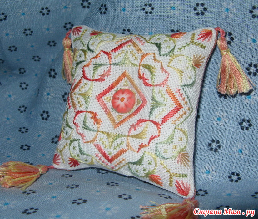 Вышита на хардангере молочного цвета, нитки DMC color variations 4120 и 4070, DMC 725, бисер чешский из остатков. Размер подушечки 9х9см.