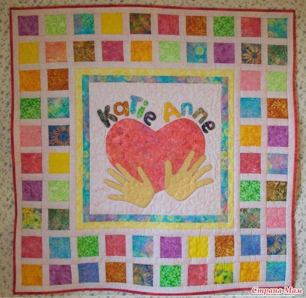 Покрывало придумывала сама. Яркие квадратики - это батик, остатки тканей от других проектов. Батик в принципе не садиться, так как в процесск производства вываривался несколько раз. Сердце, руки (папы и мамы) и буквы - аппликация на клеевой основе.