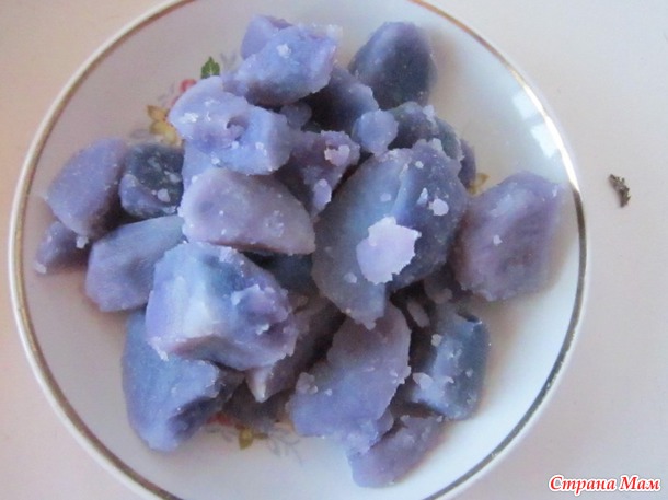 Картоху такую не видела. У нас тут есть каой то другой корнеплод, кожура красноватая, а внутри, если запечь - вот такое же безобразие. Когда-то читала где-то, что синий и фиолетовый цвет способствуют снижению аппетита.) Кажется на меня это действует на все сто.
