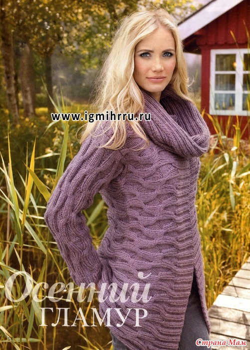 Вам потребуется: 850 (900) 950 г сиреневой меланжевой (цв. 23) пряжи Lana Grossa ALTA MODA CASHMERE (80% мериносовой шерсти, 20% кашемира, 90 м/50 г); прямые спицы № 6; круговые спицы № 6 длиной 80 см; 1 пуговица диаметром 34 мм.
