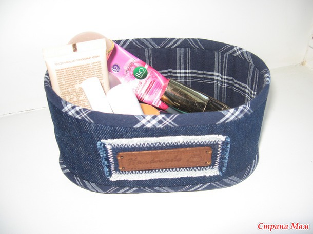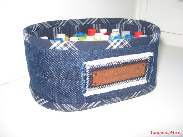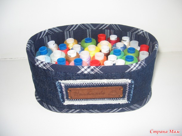 Использованные материалы- джинса, сорочечная ткань, всё укреплено дублерином и простегано с синтепоном. Для донышка использовала жесткий воротничковый дублерин.