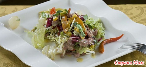 Мясной салат с пивной заправкой.