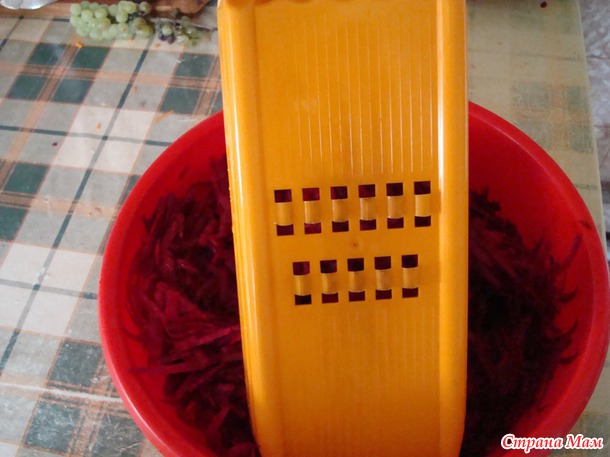 Свеклу либо режем брусочками, либо трем на крупную терку. Я люблю в борще свеклу, порезанную брусочками, мои ж домочадцы больше любят тертую. Я нашла золотую середину - купила терку Бернер