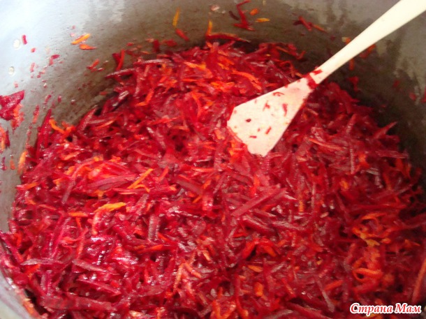 Все хорошо размешать и, когда морковь немного осядет, всыпать свеклу.