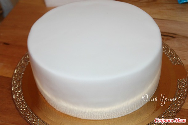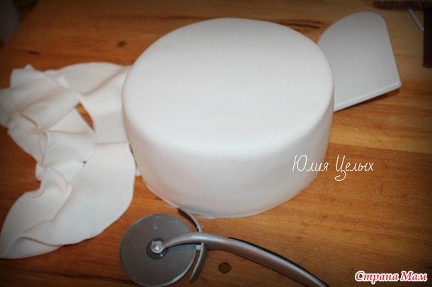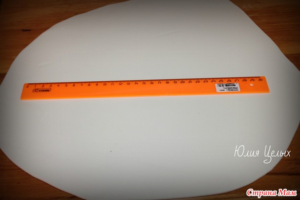 Присыпаю мастику крахмалом и раскатываю толщиной 4-5 мм. Размер круга должен быть 18 см+8 см+8 см+ еще несколько см про запас, чтобы потом не было складочек. Я люблю, чтобы сильно с запасом было, поэтому у меня вот так