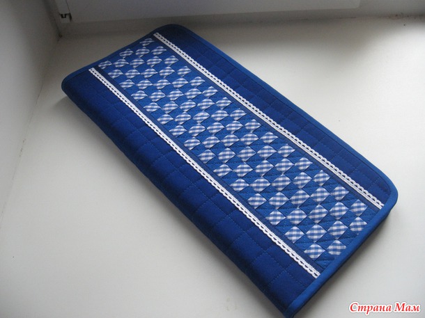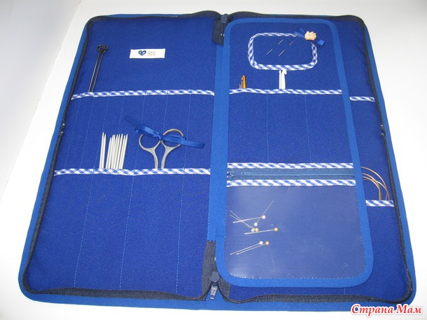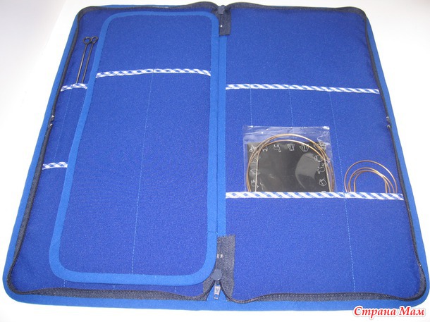Укреплен дублерином, простеган с синтепоном, застегивается на молнию. Размеры в застегнутом виде- 44 см х 21 см.
