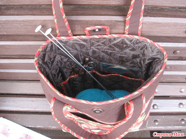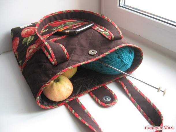 Сумочка задумана как рукодельная, с большим внешним карманом и несколькими внутренними под всякие рукодельные нужности. Сшита из габардина и американского хлопка, укреплена дублерином, простегана с синтепоном. Застегивается на магнитную кнопочку. Вполне может притвориться и нерукодельной)))