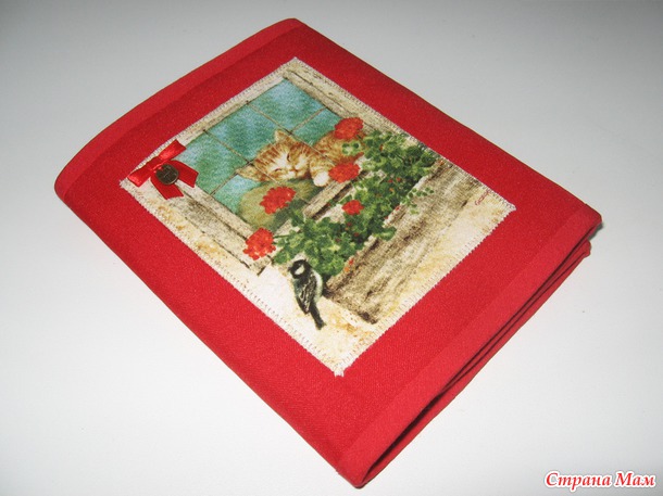 Материалы- габардин, американский хлопок, тесьма. Укреплен дублерином, простеган с синтепоном. Размеры в сложенном виде 17,5 см х 14,5 см, в разложенном- 17,5 см х 55 см.