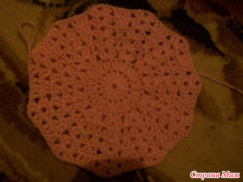 дальше вяжите в каждый ссн по 2ссн-это второй ряд, 3р-вяжите ракушку по схеме через две петли а не через одну как в схеме и у нас получается вместо 8раппортов 11, за счет этого красивое и ровное донышко, сейчас темно и фото темные но на них все хорошо видно, смотрите