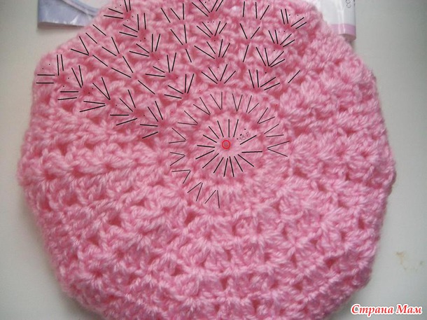 Начнем наше вязание с шапочки. Она вяжется от центра по кругу. На ниже приведенном рисунке представлена схема вязания шапки: