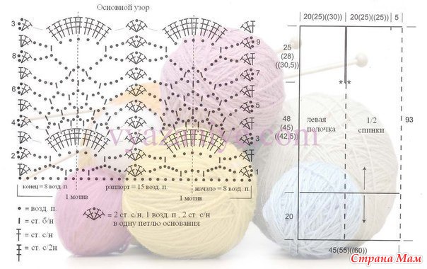 Для маленького и большого размеров на спинке с обеих сторон прибавить 1 ст. с/н или 3 возд. п.