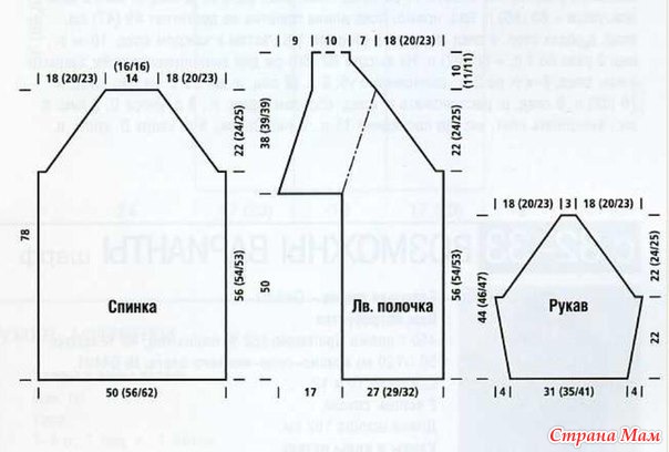В таком распределении вязать до плеч еще 19 (21) ((23)) р. = всего общая длина 55 р.