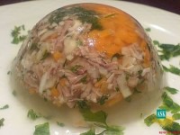 Заливаем наше бедро и крылья 1,5 литрами воды и варим, как холодец. Добавляем целую мытую луковицу в шелухе (для придания бульону красивого золотистого цвета), душистый горошек, лавровый лист, целую морковку, соль. Замачиваем желатин. Способ приготовления указан на пачке. Если воспользуетесь готовой смесью для приготовления заливного, то обратите внимание, что в состав смеси уже входит соль, и добавлять ее надо только после пробы. Через два часа мясо достаем, отделяем от костей, режем и выкладываем в миску. Украшаем резаной морковкой. Можно добавить отварное яйцо, нарезанное колечками. Растворяем желатин в бульоне. Добавляем мелко нарубленный чеснок. Заливаем мясо полученным бульоном и даем застыть. Заливное предполагает небольшой слой застывшего бульона, но в данном случае можно приготовить как холодец – в глубоких мисках. Хорошо пойдет с картошкой-«топтанкой» – размятой картошкой с обжаренным луком.