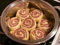 Пока вода закипает, готовим штрудели. Тесто раскатываем, посыпаем сверху мелко рубленым луком. Выкладываем на тесто фарш и разравниваем его. Если теста получилось многовато, то обрезаем лишнее. (Из него можно сделать прекрасные лепешки – пожарить в сковороде на масле.) Затем тесто вместе с фаршем сворачиваем в рулет. Готовый рулет разрезаем на части по 2-3 см и выкладываем сверху картофеля. Кастрюлю плотно закрываем крышкой и оставляем на маленьком огне минут на 40. Наши штрудели готовятся на пару, сверху картошки. Как только картофель будет готов, можно подавать ужин к столу. Сверху на каждый штрудель выложить по ложке сметаны. Украсить свежей зеленью.