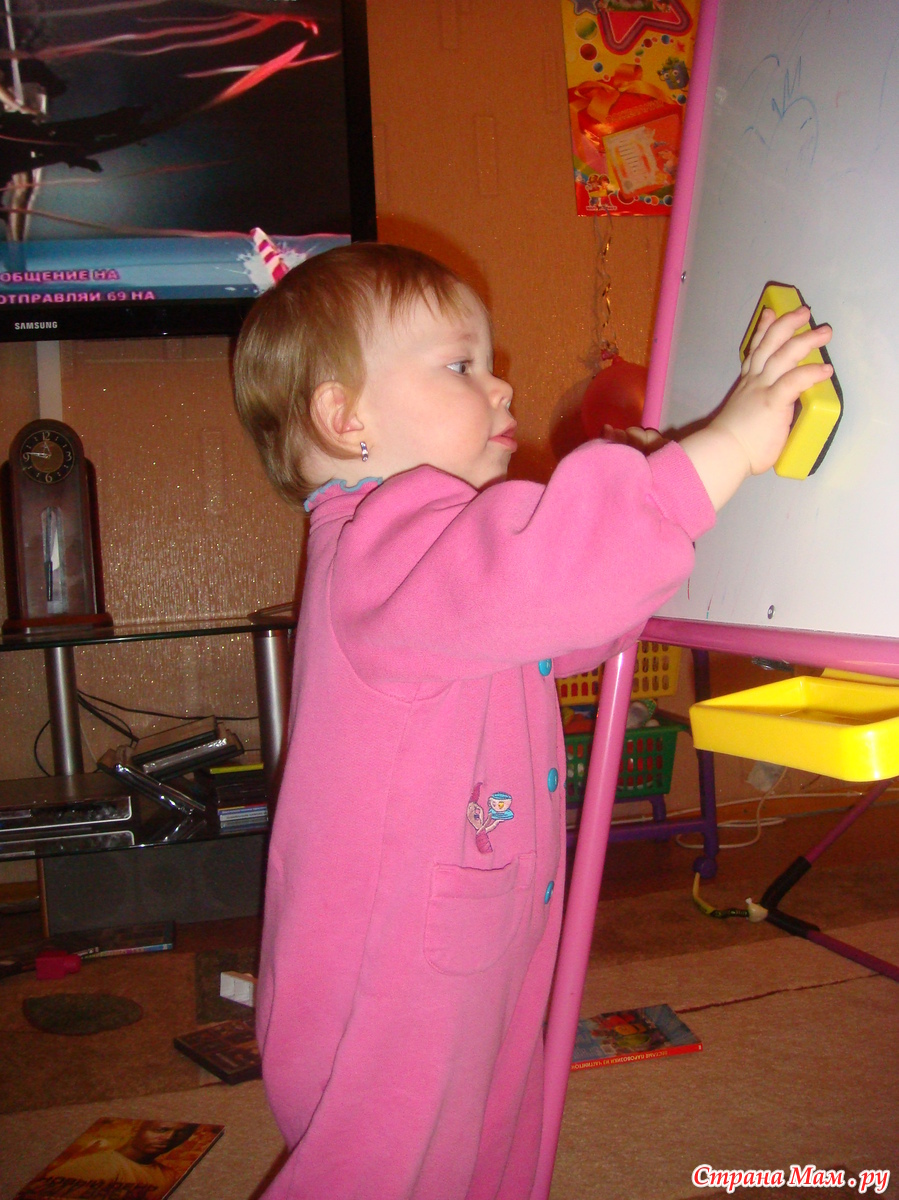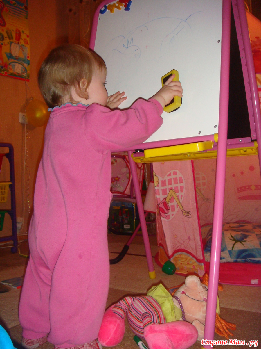 Первый наш опыт я посчитала неудачным, но потом поняла, что была неправа!!! Все таки какой-ни-какой опыт был для нашей прЫнцессы! Это было месяц назад на наше годовасие. Мы болели, поэтому праздника как такового не получилось, (об этом я писала вот здесь https://www.stranamam.ru/post/805922/ ) поэтому развлечения придумывали по «ходу представления!» И одним из них было рисование мелками (для этого я купила мелки на какой-то гипоаллергенной основе – насколько можно было судить по составу – их можно было «нечаянно» съесть! Меня это устраивало.) Так и получилось, она его (хорошо, что дала только один мелок) просто съела!!! Правда не весь… Но похоже ей это понравилось даже больше, чем наносить хаотические штрихи на доску!!!