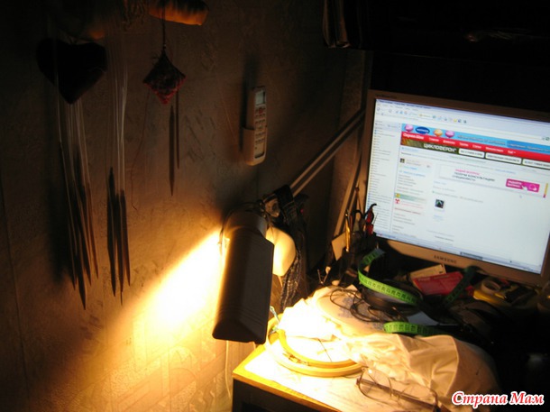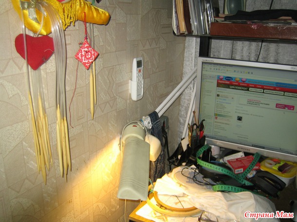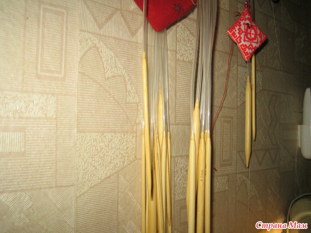 Сейчас уже ночь и в моем уголке дедушки Дурова творческий беспорядок, т. к. ночью у меня прилив творческой энергии. Пусть простят меня рукодельницы, но расставлять все для фотосессии я не стану, мне так лучше работается. Ночью я вышиваю, но спицы все равно под рукой (слева на стене).