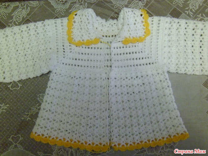 В комплекте в оригинале кокетка связана столбиками с двумя накидами, но мне так не понравилось, получается очень "дыряво", вы смотрите сами как вам больше нравится.