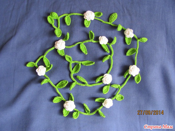 Цветочки вяжете с желаемым числом лепестков, сворачиваете из спиральки и сшиваете. Потом пришиваете к вашей "веточке"