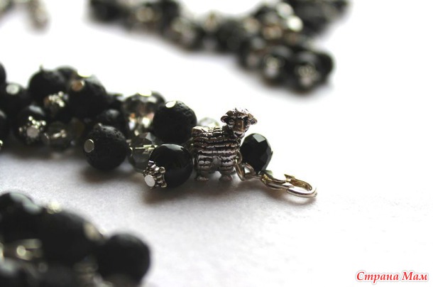 Использованы бусины черного агата, бусины вулканической лавы, граненые черные и дымчатые чешские бусины. Ну и овечка символ наступающего года