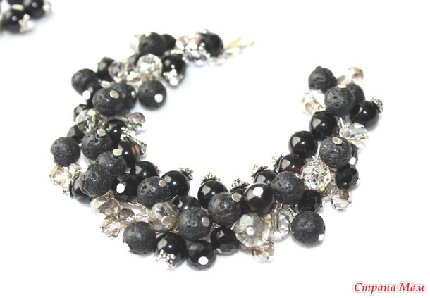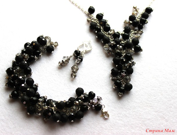 Комплект украшений включает колье, серьги и браслет. Классический черный всегда благороден и к месту. Фото конечно не передаст блеск граней чешских бусин. Украшения за счет них играют и выглядят празднично. В итоге я постаралась передать хотя бы фактуру и объем.