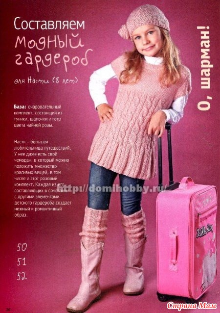 Очаровательный комплект для девочки 8 лет из вязаной туники, гетр и шапочки легко сочетается с разными вещами. Каждую вещь можно носить по отдельности, а в целом они создают нежный романтичный образ.