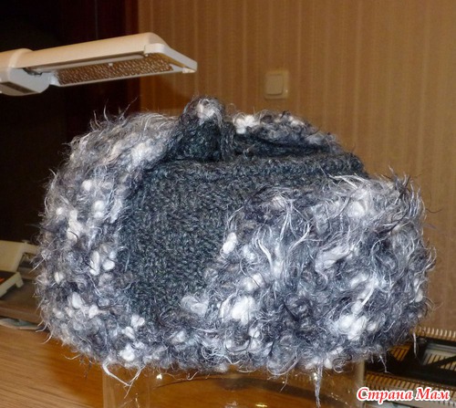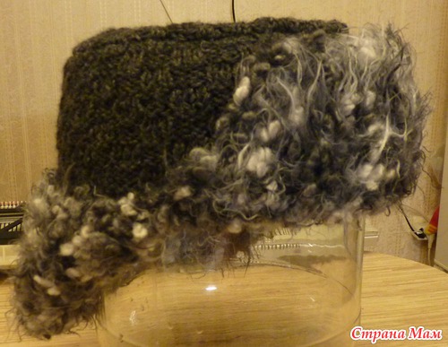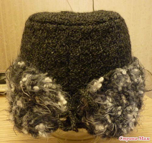 Внешняя часть шапки связана из шерсти (75%, 100г/200м) спицами №4. "Меховая" часть это букле с небольшим содержанием шерсти (35%), чтобы не кололось (50г/33м), использовались спицы № 7.