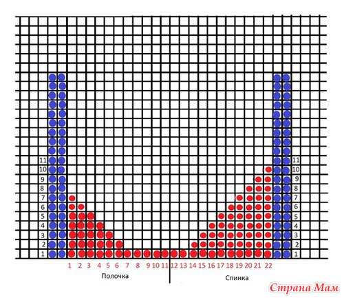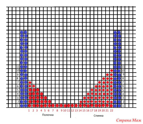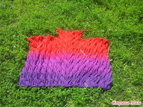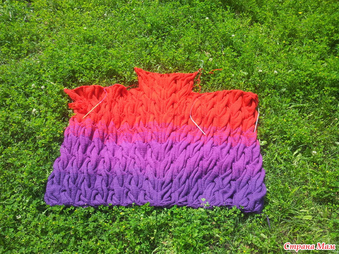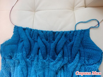 Красные точки это лицевые петли проймы, синенькие это изнаночные петли, которые у нас между кос и они остаются для втачивания рукава.