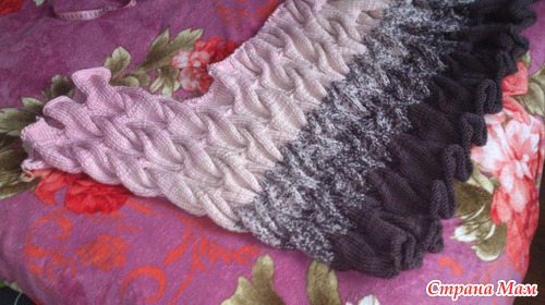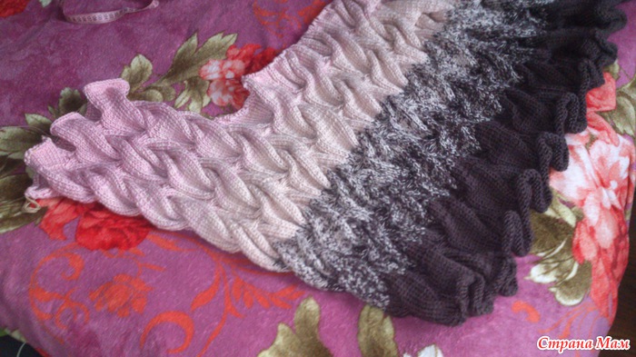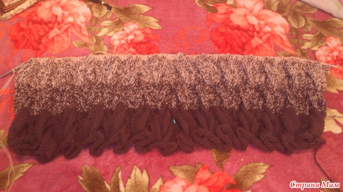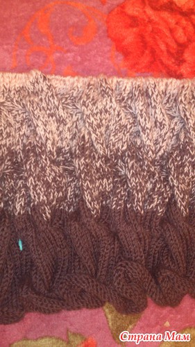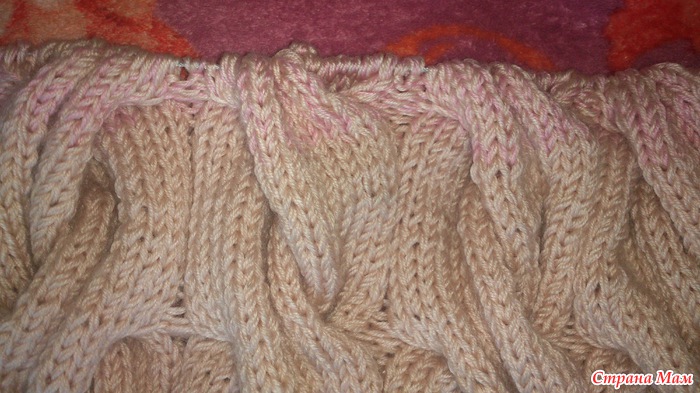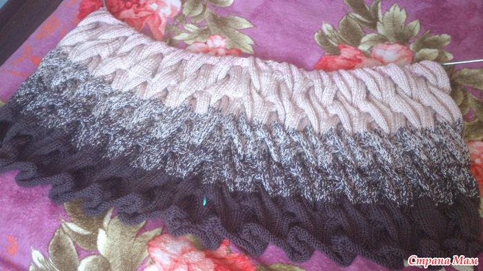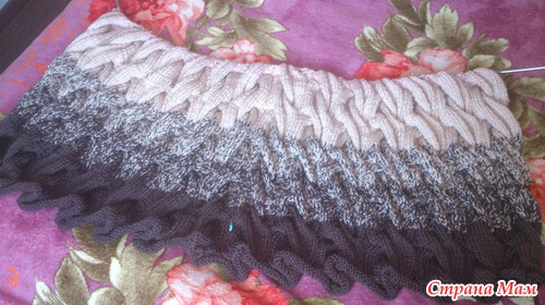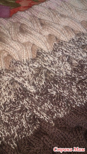 Вот мое продвижение. перешла на бежевый цвет. буду вязать 30 рядов, потом перейду на третий цвет.