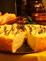 взять разъемную форму26 см, выложить тесто тонким слоем, сделать бортики. влить сверху начинку и убрать в предварительно разогретую духовку на 50 мин. Если начнет пригорать раньше времени, поставьте на "этаж" ниже сковородку с водой. Готовность пирога проверяется достаточно просто, слегка встряхните форму, в середине пирог должен немного всколыхнуться (как желе). Дайте тортуостыть... и уберите в холодильник, минимум на 2 часа... там он дойдет. Украшайте по желанию. Я просто растопила шоколад.