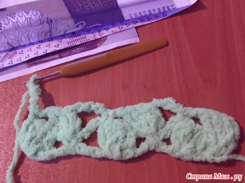 Отступаем 3 петли ( в софти если и на глазок первый ряд свяжем, ничего страшного) И снова начинаем вывязывать 4 столбика с 2 накидами в одну петлю.