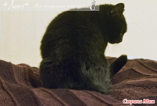 Эта фотка, конечно, неудачная и размеров пледа не отражает, зато степень желания кошки "прокачать энергетику" моих рукоделий отражает вполне!