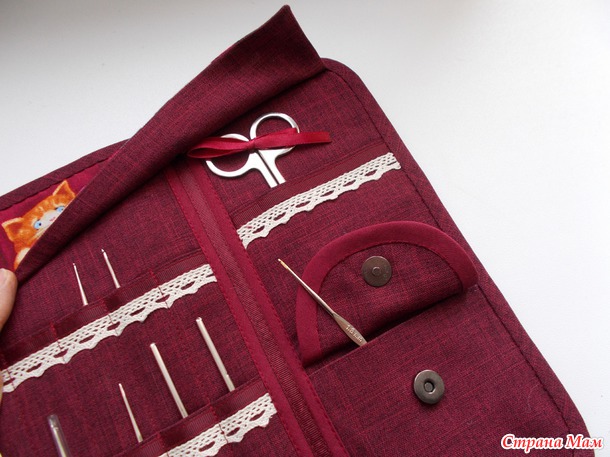 Кроме кармашков для крючков, предусмотрены кармашек для ножниц и кармашек с клапаном на кнопке для мелочей