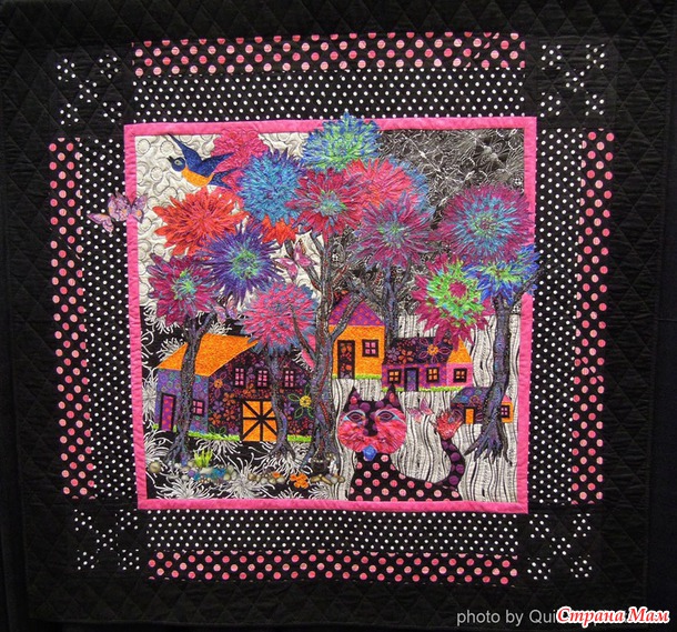В этом квилте использована машинная сборка, аппликация и машинная стежка цветными нитками. Какая яркость красок!
