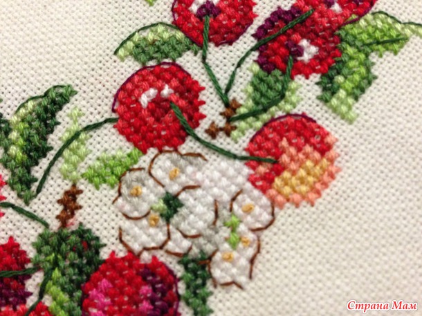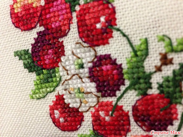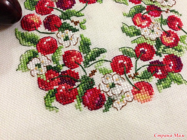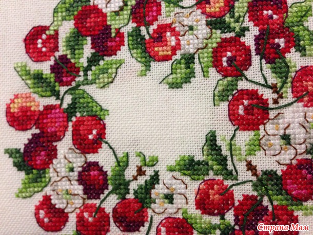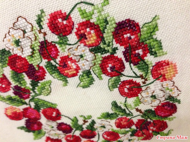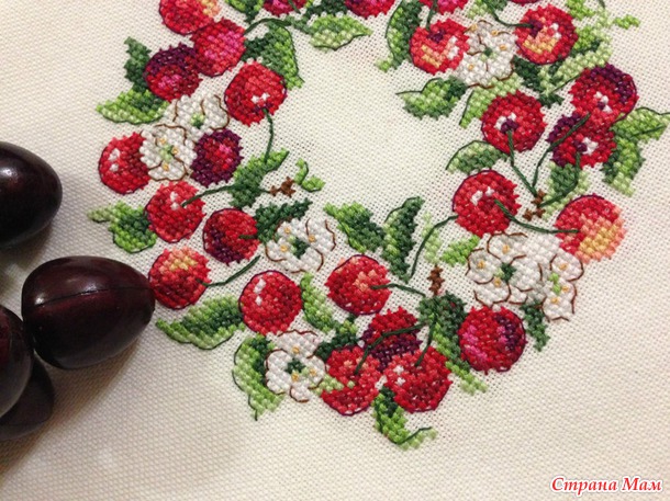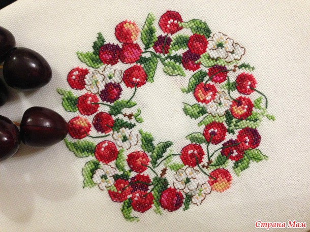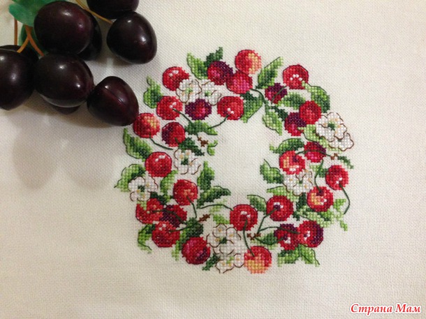 Вот такой вишневый веночек из журнала Creation point de croix (номер 30, май-июнь 2013г.), дизайн V. Enginger.