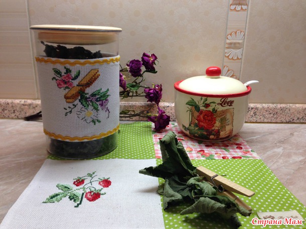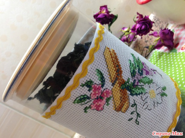 А еще я на зиму приготовила мятные листики, и для их хранения прикупила баночку. Украсить я ее решила вот такой мини вышивкой на ленточной канве. Схема из книги V. Enginger Dans mon jardin.