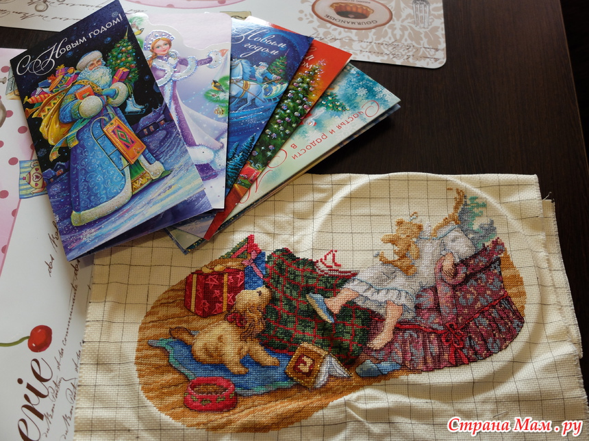 Сегодня у меня была очень плодотворная ночь,наконец-то я добралась до Санты, так давно хотела уже начать красным цветом вышивать, сама не заметила как кусочек отшила в один миг. Подушечка у девочки отшилась полностью под фильм Красотка, который вчера шел по 1 каналу (мой самый любимый фильм). Никак не могу закончить бэк на лице у девочки, перешивала 3 раза, все криво и косо, может завтра все же добью его. Желание вышивать растет с каждым днем все больше и больше, ведь скоро уже и елочка появится))))