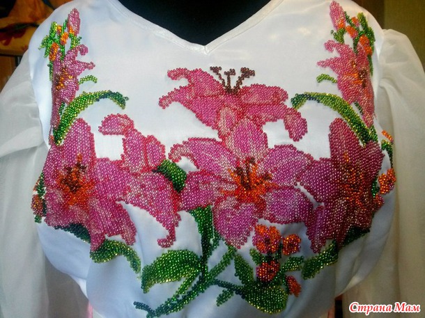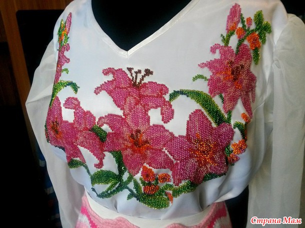 Ну и моя гордость - вышиванка, не классическая, зато с моими любимыми лилиями) Ткань атлас, схема была нанесена на ткань. Кроили и шили в ателье. рукава из шифона.