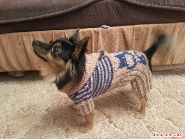 Вот такой комбезик связался для собачки сына, пока он у нас гостил. Если кому интересно, в крации опишу. Начало с задних лап. По отдельности резинкой 2*2 на четырёх спицах вяжутся штаны, до нужной длинны. Закрываем по 1/3 петель каждой штанины. Затем соединяем воздушными петлями и вяжем на двух спицах до середины спины. (постоянно отлавливая и примиряя на свою собачку) Потом опять добавляя воздушных петель соединяем и вяжем на четырёх спицах до подмышек. Рукава вяжем также как и штанины по отдельности на четырёх спицах, а потом привязываем их методом реглан, когда петли убавятся до обхвата шеи вяжем воротник резинкой 1*1, потом по желанию с внешней стороны можно капюшончик привязать. Но он не очень функциональный, так чисто декоративный. Даже не знаю понятно ли описала, если будут вопросы спрашивайте. Удачи всем