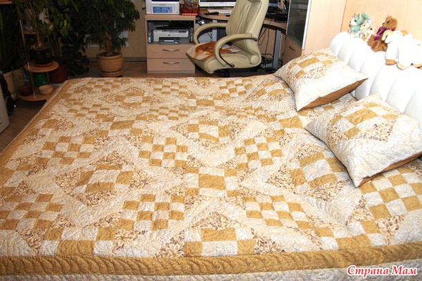 Сшила я покрывало на огромную кровать, и размеры готового покрывала получились 2,8 метра х 2,8 метра. Не больше и не меньше.