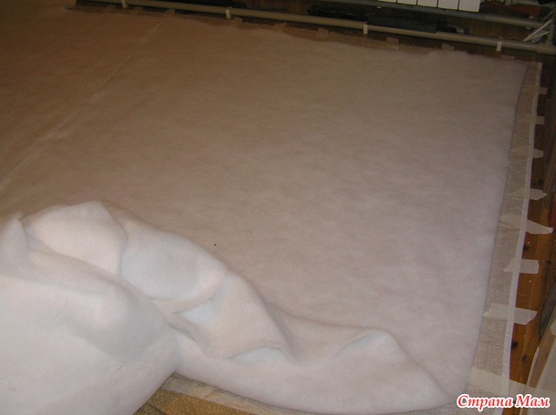 Разложила на полу подложку, зафиксировала ее малярным скотчем, поверх - холлофайбер, и лоскутный верх. Все скрепила булавками, чтобы слои не съезжали.