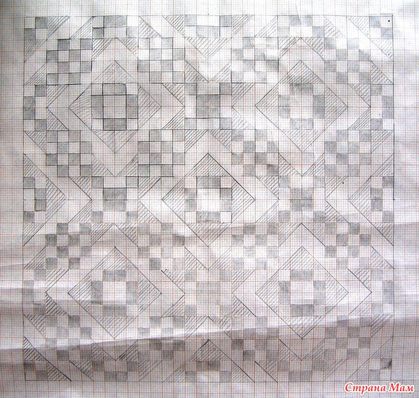 Пришлось схему покрывала сделать на миллиметровке, чтобы потом рассчитать размеры блоков и не ошибиться.