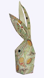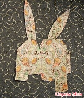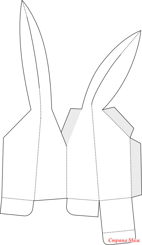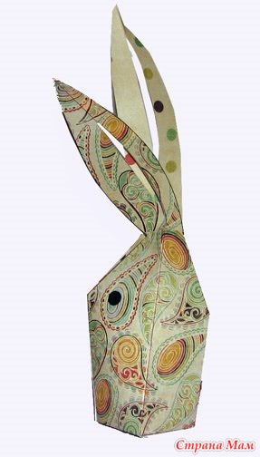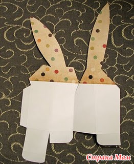 На обратную сторону листа на уровне ушей приклеиваем цветную бумагу, чтобы уши в готовой упаковке смотрелись хорошо. Вырезаем, склеиваем.