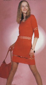 3-й ряд — ст. без накида, при обвязке «арки» каждый 9-й, 10-й и 11-й ст. прикрепите к каждому 11-му, 12-му и 13-му ст. без накида верхней стороны нижней части юбки. Так же соедините рукава с нижними частями. Верх юбки обвяжите крючком, как низ юбки, и соедините со станом, как описано выше. По низу стана выполните такую же обвязку из «арок», как по верху юбки, пропуская клубок между ранее связанными «арками».