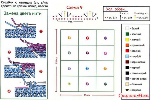 Вязать 12 прямоугольников. Для каждого прямоугольника пряжей необходимого цвета набрать цепочку из 48 в. п. и вязать полуст. с/н по соответствующей схеме, учитывая, что при замене цвета нити на протяжении р. следует закрывать полуст. с/н нитью следующего цвета, оставляя нить предыдущего цвета на изн. стороне.