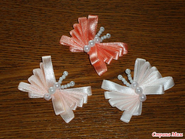 Данные бабочки изначально видела из натурального шелка, но они прекрасно смотрятся из лент.