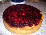 Теперь переходим к начинке. Отделяем белки от желтков. Желтки растереть с сахаром. Добавляем творог и перемешиваем. Затем добавляем крахмал. Отдельно взбиваем белки с щепоткой соли. Соединяем твороженную смесь с белками и аккуратно перемешиваем. Ставим тесто форму в заранее подогретую до 180 градусов духовку и запекаем 15 минут. Затем достаем форму из духовки и выкладываем на тесто твороженную начинку. Теперь переходим к ягодам. Делим ягодную часть пополам. Половину измельчаем в блендере с добавлением двух столовых ложек сахара. В полученную смесь выкладываем целые ягоды. Все это отправляем поверх твороженной массы. Ставим пирог запекаться в духовку минут на 40-50. Подавать пирог можно как в горячем, так и холодном виде. Приятного аппетита