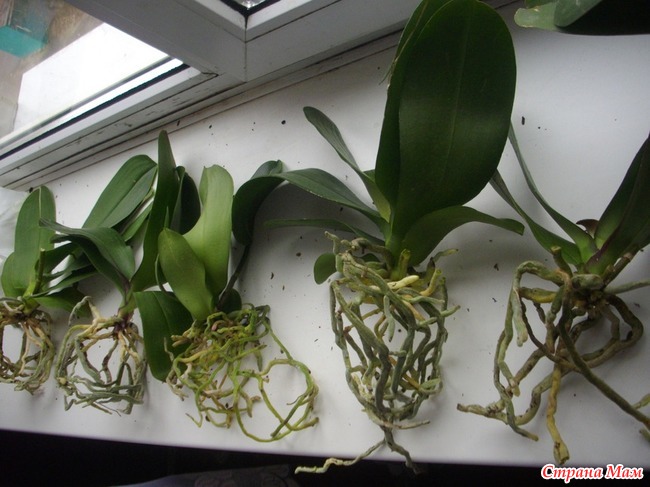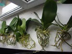 Вот и пришли мои орхочки. Ждала я их неделю. Отправили мне их в понедельник в среду получила ( кому интрессно пересылка Новой почтой - за 5 цветочков - 45 грн). Упаковано все было хорошо, замерзли или нет сказать еще не могу, на вид не чего цветочки. Сам субстракт был обмотан туалетной бумагой, цветок с горшком в газету, при пересылки не чего не телепалось. Гнилые и сухие корешки я пообрезала, на некоторых цветах корешках были уже следы реанимации - зеленкой замазанны. Ну вот вам фото что имею, а теперь помогайте реанимировать